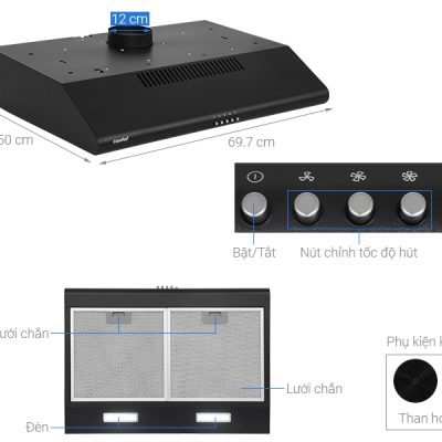 - Hút thải tuần hoàn bằng than hoạt tính hoặc hút đẩy trực tiếp bằng ống dẫn khí đường kính 12 cm đáp ứng mọi thiết kế không gian bếp.