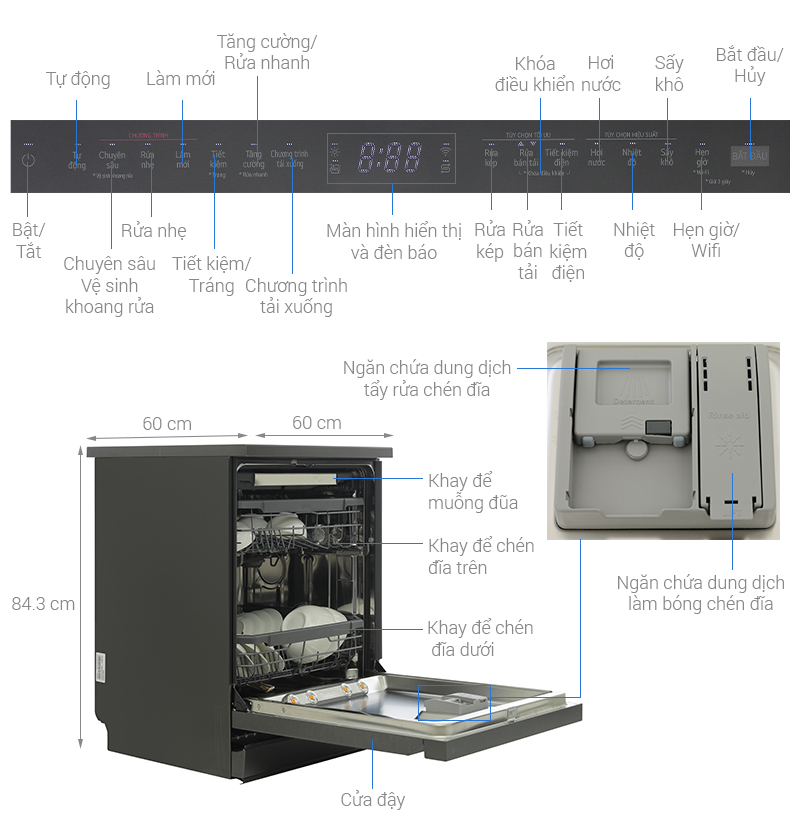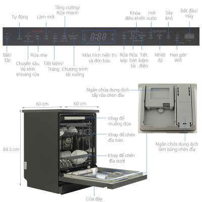 - Tiện ích Hoạt động êm (ồn <50dB), Có sấy, Rửa nước nóng, Điều khiển bằng điện thoại